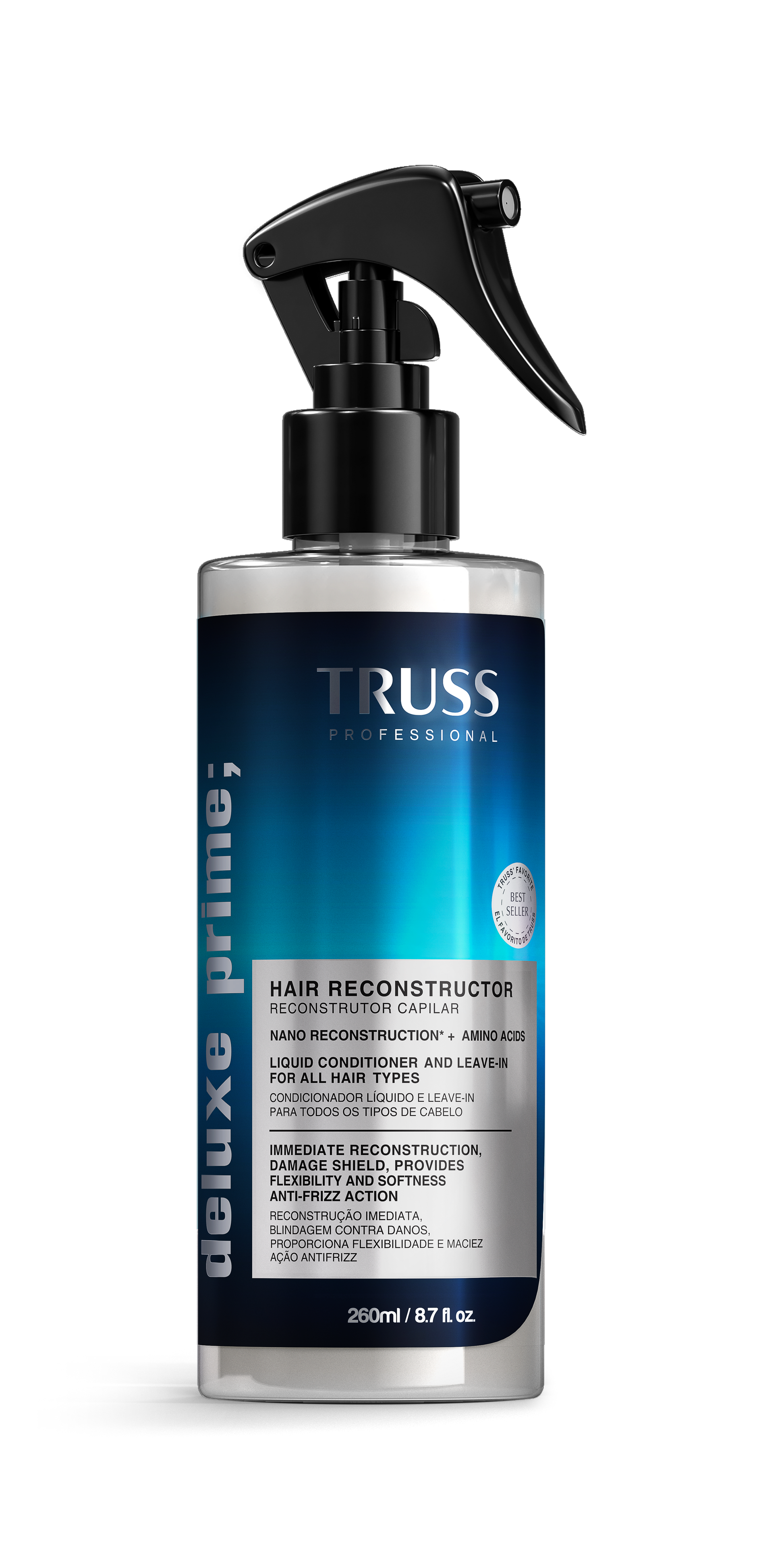 El producto estrella de TRUSS es un versátil spray con proteínas que restaura el cabello desvitalizado, frágil, dañado y tratado químicamente. Desenreda el cabello, dejándolo suave y sedoso. Puede usarse como tratamiento (después del champú y antes del acondicionador), como loción sin enjuague o como loción pre-secadora.